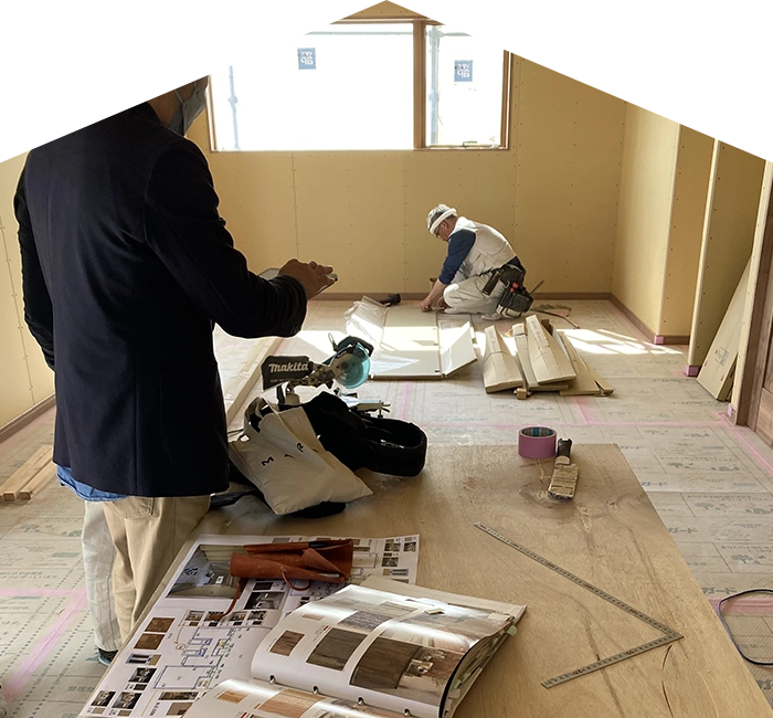 当社は営業や設計、現場担当など分業はしていません。同じ担当者が設計から打ち合わせ、現場、アフターサービスまで一括管理しています。担当者が途中で変わる事が無いから、コミュニケーションもスムーズ。担当による認識のズレも無いため、打ち合わせ時のイメージのまま家が出来上がります。また家の事を知り尽くした大工経験のある担当者が現場管理をしておりますので、安心して大切な家造りをお任せください。